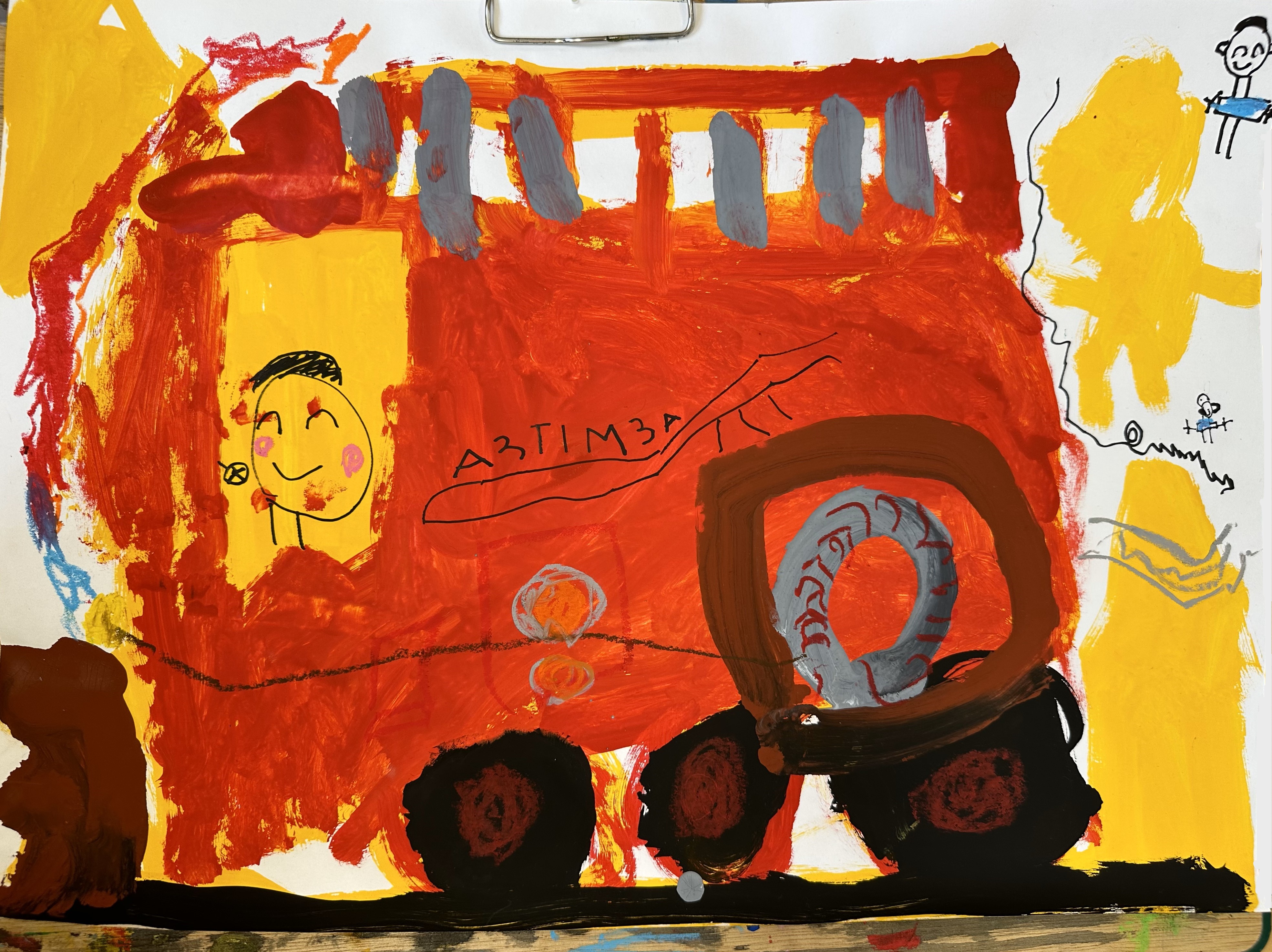 「消防車だ!」保育園年長 絵画指導研修にて(導入、重ね塗り、塗り広げ、描き加え)