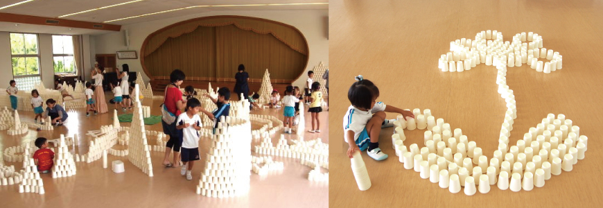 例)「1万個の紙コップアート」「プチプチで衣装作り」